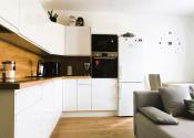- kuchynská linka so spotrebičmi (indukčná varná doska, el. rúra, digestor, mikrovlnka, chladnička s mrazničkou, umývačka, varná kanvica)