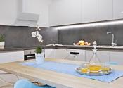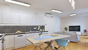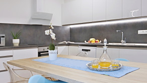 - Kuchynská linka je so spotrebičmi (el. rúra, el. varná doska, digestor, americká chladnička s mrazničkou, mikrovlnka).