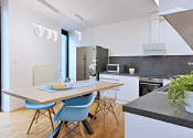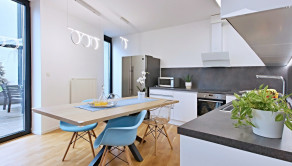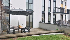 - Po pravej strane sa nachádza veľký otvorený priestor, ktorý pokrýva obývačku, jedáleň a kuchyňu s celkovou výmerou 40m2 a vstupom na súkromnú terasu so záhradkou.