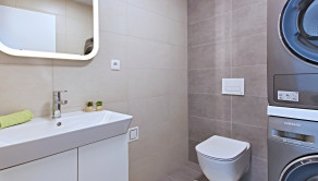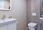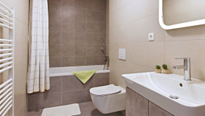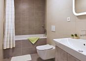 - Oproti vstupu na nachádza hlavná kúpeľňa vybavená vaňou, toaletou, umývadlom a odkladacími skrinkami.