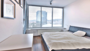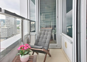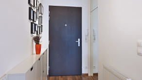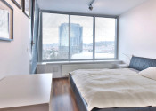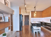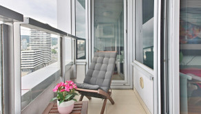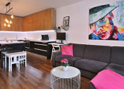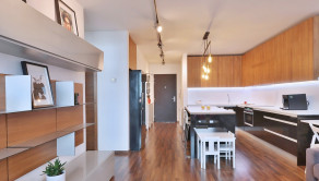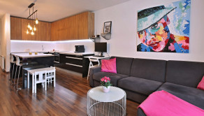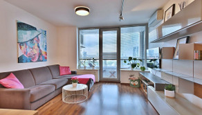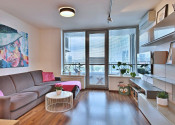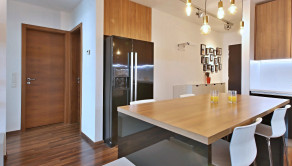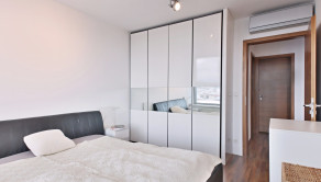 Vybavenie: vstupné bezpečnostné dvere, zvukovo-izolačné hliníkové okná a terasové dvere s 2-sklom, s možnosťou vetrania cez okno, interiérové tieniace rolety manuálne ovládané na všetkých oknách, vykurovanie cez radiátory, 2x klimatizačná jednotka, kuchynská linka so vstavanými spotrebičmi značky (varná doska zn. SIEMENS , elektrická rúra zn. SIEMENS, digestor zn. ELICA, umývačka riadu zn. SIEMENS , chladnička s mrazničkou zn. BOSCH) jedálenský ostrovček a 4 stoličky, laminátové plávajúce podlahy, dlažba vo WC a kúpeľni, vstavaný šatník.