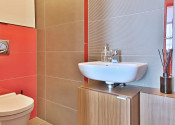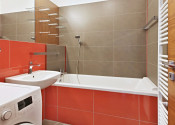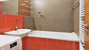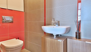 V kúpeľni sa nachádza vaňa, umývadlo, prípojky na práčku, úložná skrinka. V oddelenej toalete je závesné WC Geberit, umývadlo s batériou. V každej miestnosti sa nachádza dátová zásuvka pre Setobox a IP telefón, vysokorýchlostný optický internet od Orangu, meraná spotreba vody a vykurovania. Ustredne kurenie v dome.