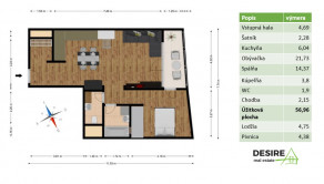 Byt pozostáva z chodby, šatníka, obývacej izby spojenej s kuchyňou, spálne, kúpeľne, samostatného WC a loggie.