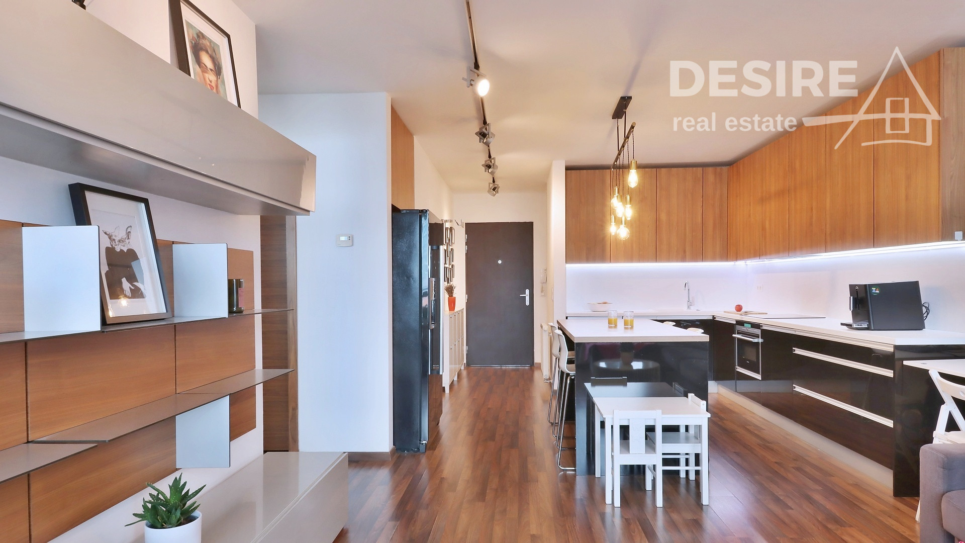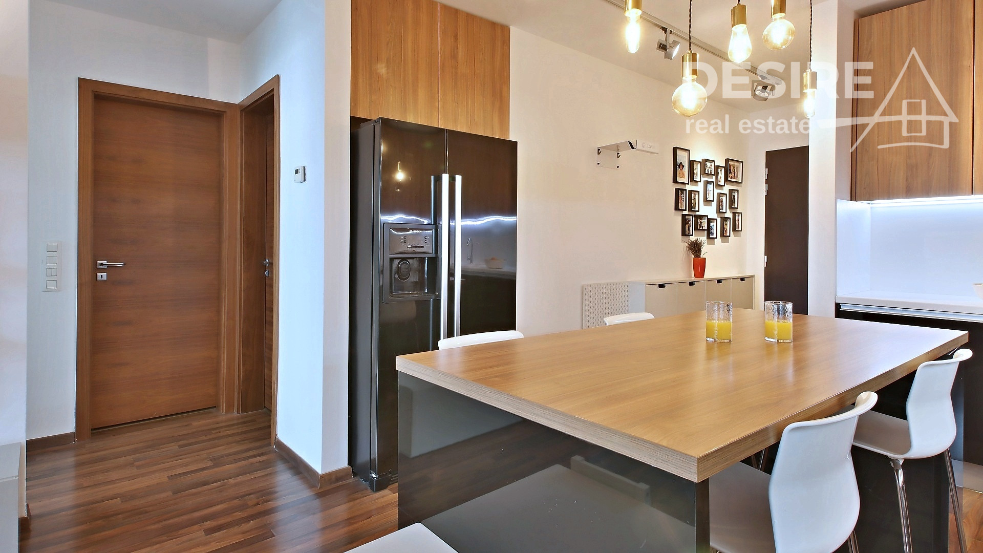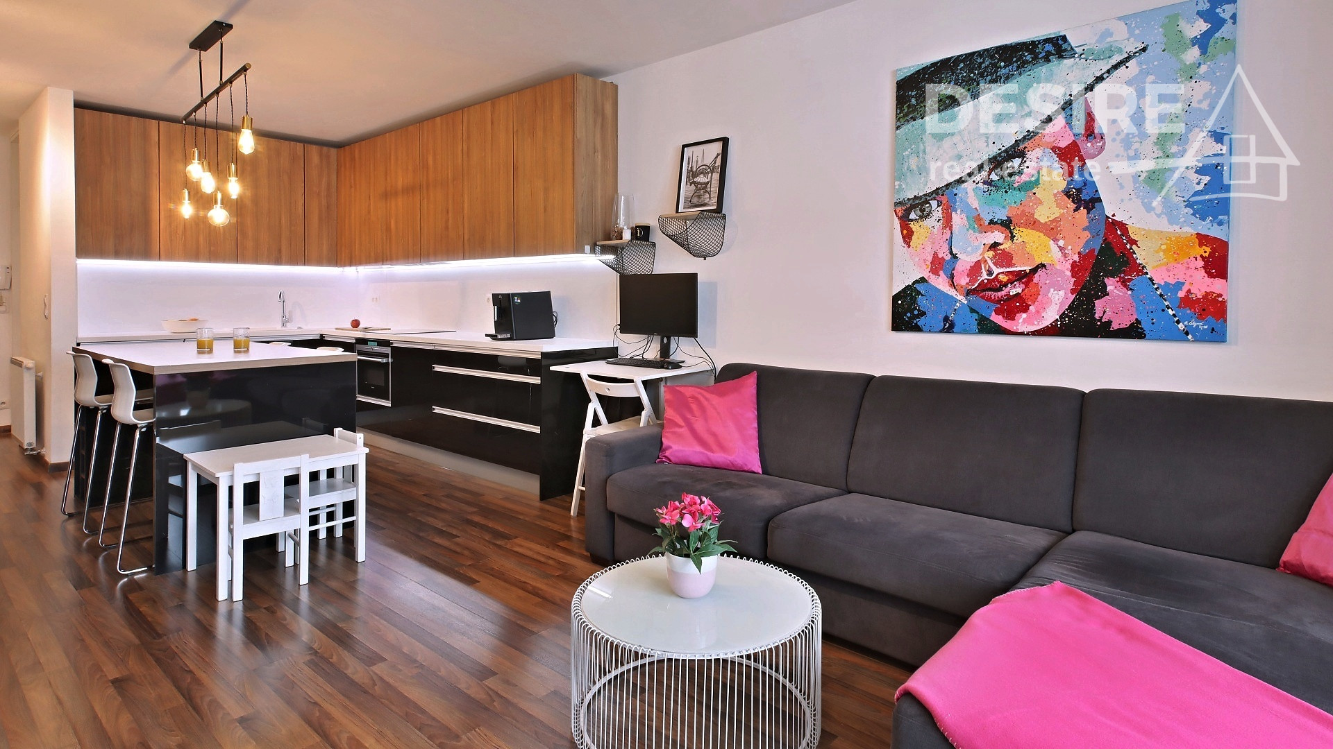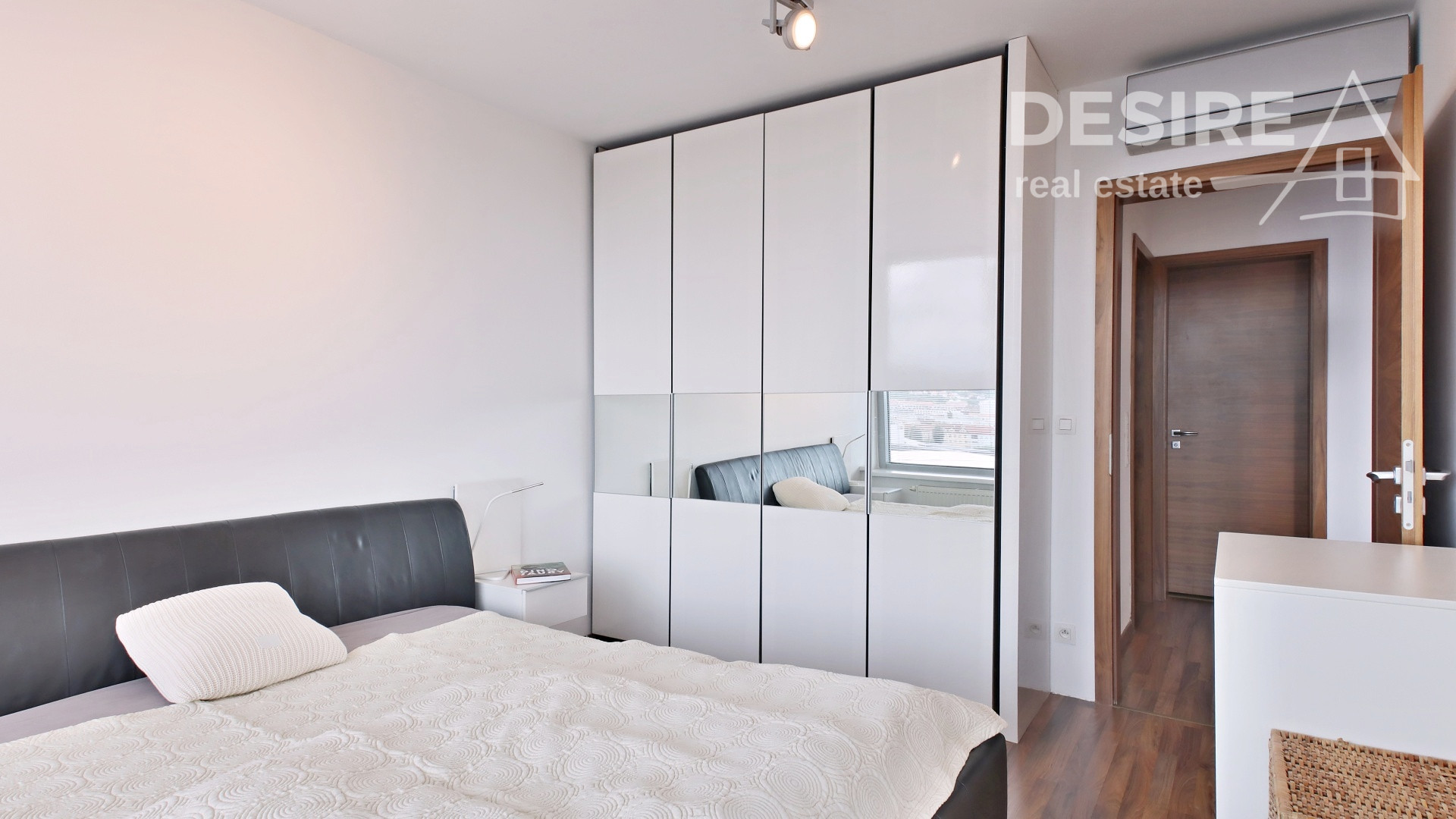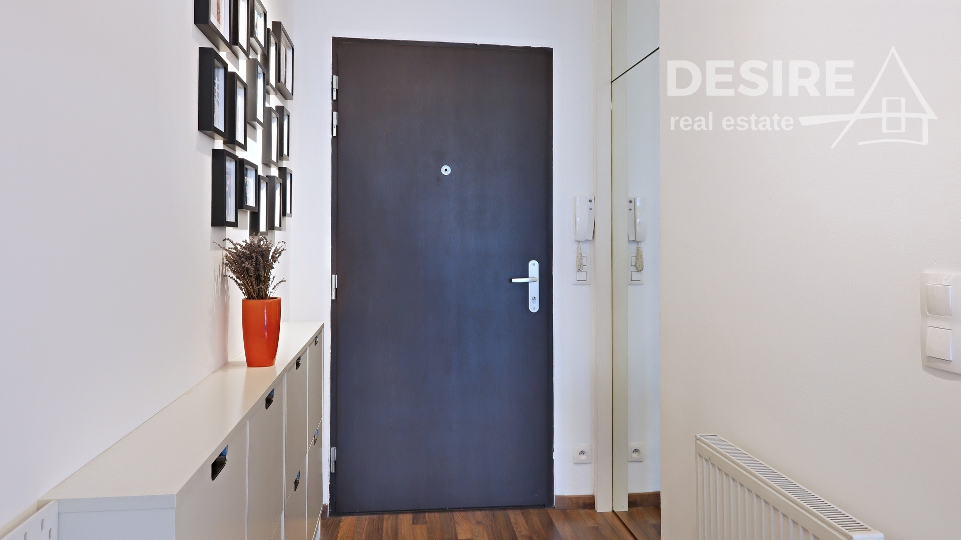 Vybavenie: vstupné bezpečnostné dvere, zvukovo-izolačné hliníkové okná a terasové dvere s 2-sklom, s možnosťou vetrania cez okno, interiérové tieniace rolety manuálne ovládané na všetkých oknách, vykurovanie cez radiátory, 2x klimatizačná jednotka, kuchynská linka so vstavanými spotrebičmi značky (varná doska zn. SIEMENS , elektrická rúra zn. SIEMENS, digestor zn. ELICA, umývačka riadu zn. SIEMENS , chladnička s mrazničkou zn. BOSCH) jedálenský ostrovček a 4 stoličky, laminátové plávajúce podlahy, dlažba vo WC a kúpeľni, vstavaný šatník.