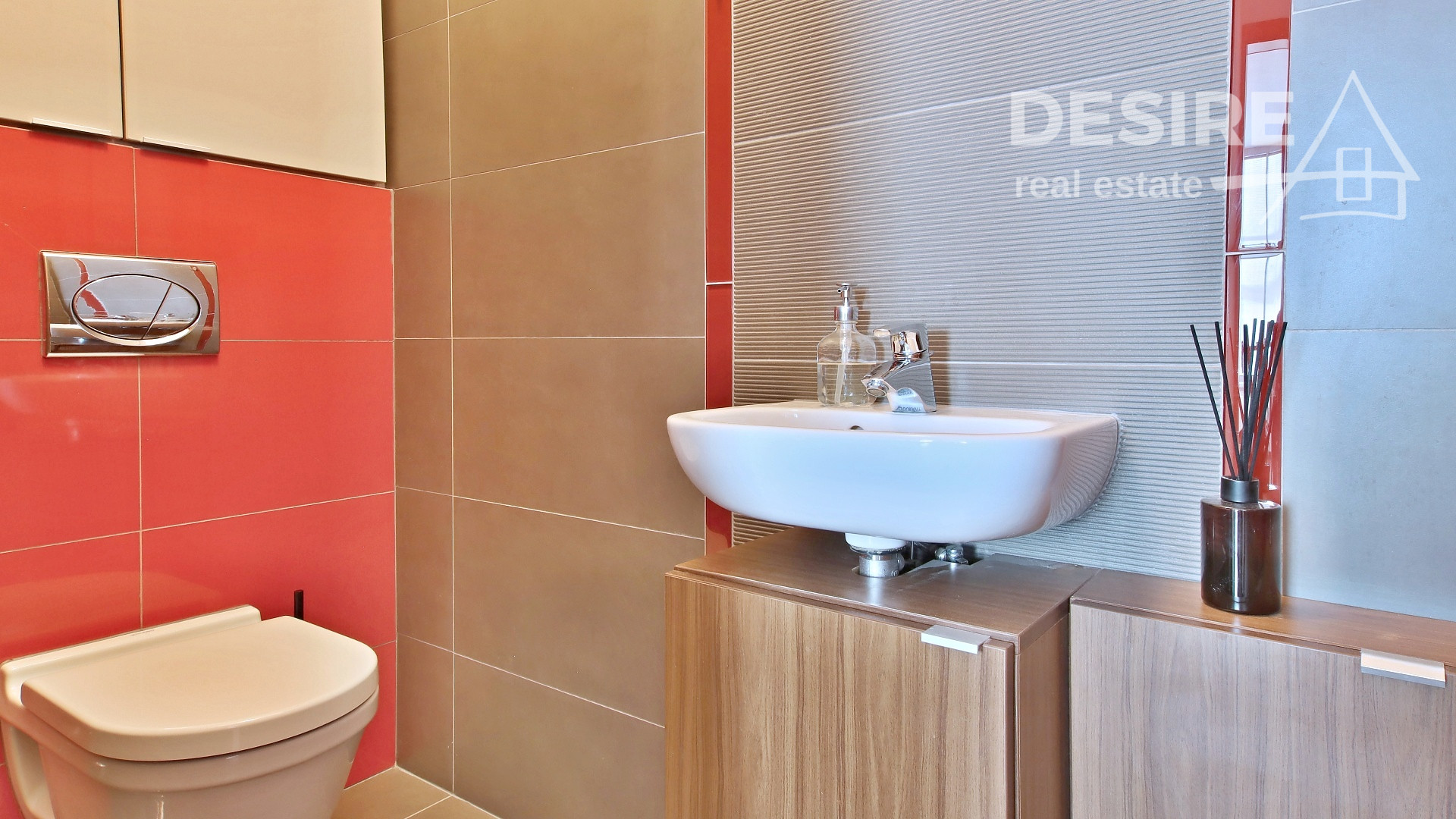 V kúpeľni sa nachádza vaňa, umývadlo, prípojky na práčku, úložná skrinka. V oddelenej toalete je závesné WC Geberit, umývadlo s batériou. V každej miestnosti sa nachádza dátová zásuvka pre Setobox a IP telefón, vysokorýchlostný optický internet od Orangu, meraná spotreba vody a vykurovania. Ustredne kurenie v dome.