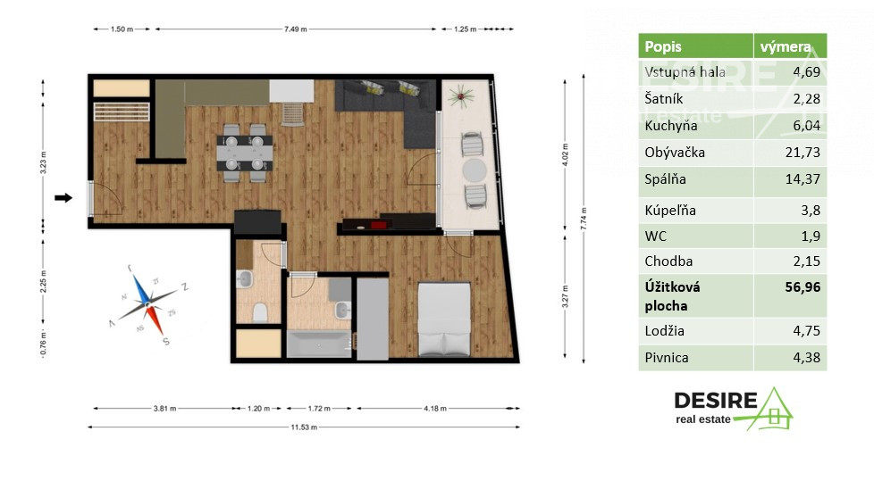 Byt pozostáva z chodby, šatníka, obývacej izby spojenej s kuchyňou, spálne, kúpeľne, samostatného WC a loggie.